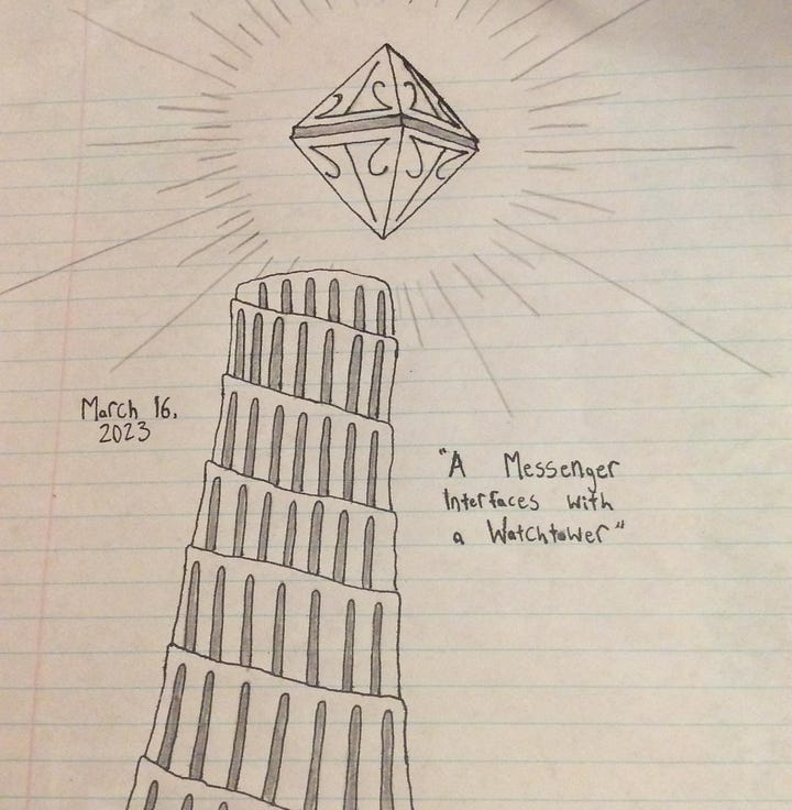 Long time readers will recognize that this Watchtower is both the ‘angel’s pyramid’ and the ‘five shells’ simultaneously. The vision formally solved a long standing problem I’d been banging my head against for the entire previous year, namely: why the capstone of the angel’s pyramid corresponds to the outermost shell rather than the innermost.