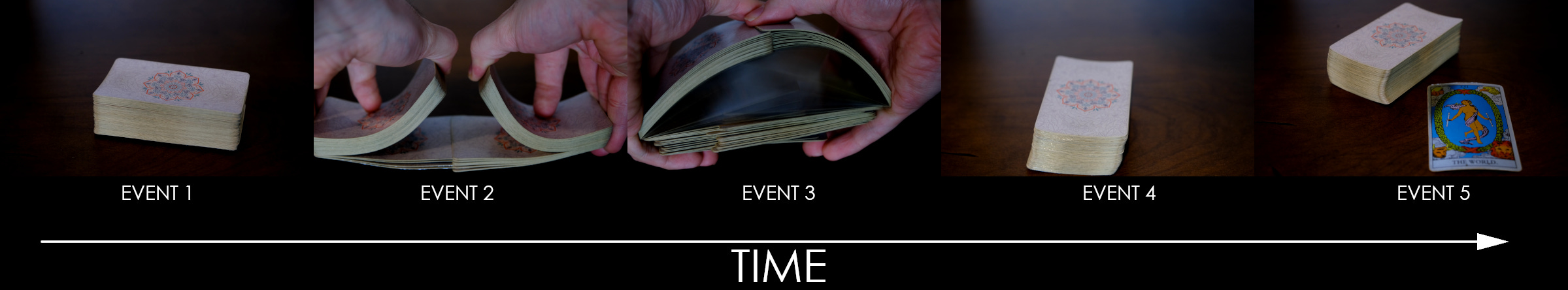Suppose I shuffle my tarot deck a few times and then pull a particular card; in this case, it’s the World card. We can model what happened in two ways.